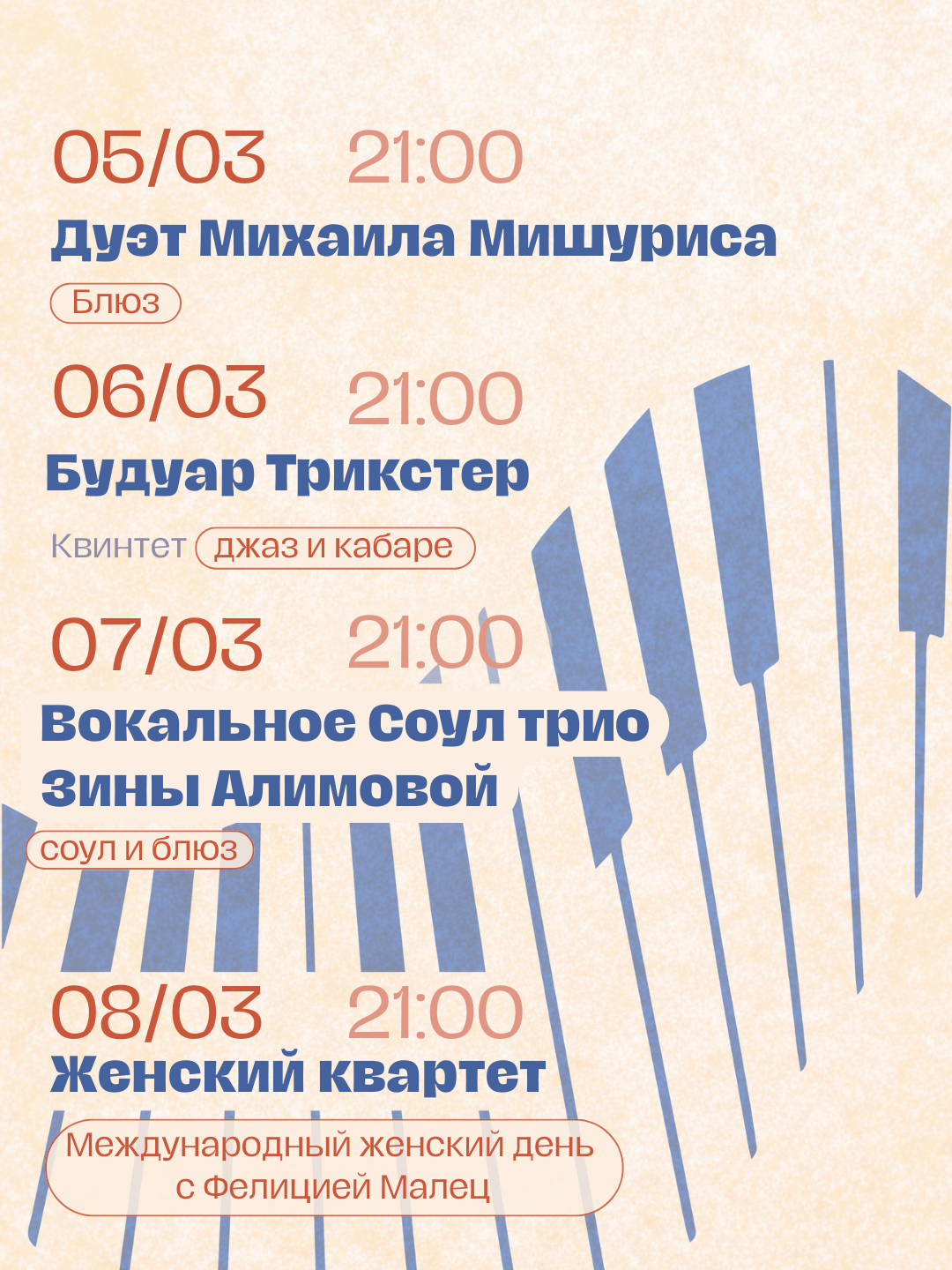На этой неделе наслаждаемся живой музыкой с четверга по воскресенье: будет блюз, джаз-кабаре, соул и специальная программа в честь 8 марта